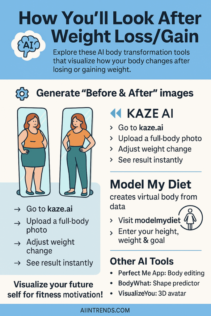 Among the most popular are KAZE AI and Model My Diet, which let you visualize your before-and-after transformation in seconds.